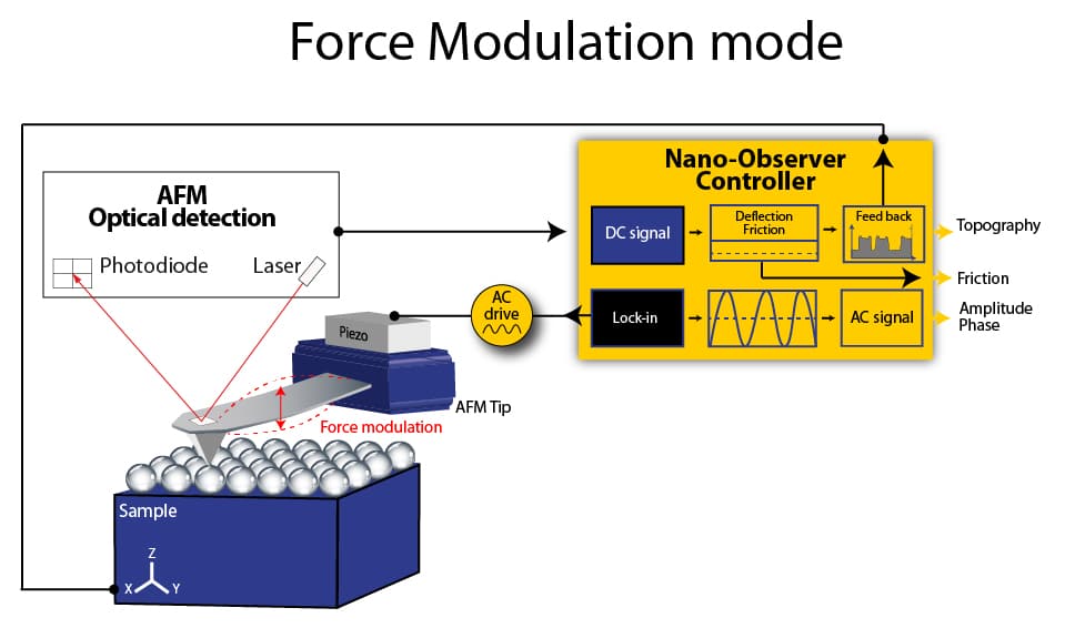 Force modulation mode is a mode of contact AFM. A mechanical oscillation is applied to the tip during the scan. A map of mechanical properties is carried out by measuring the amplitude of oscillation and the offsets of the phase signal.